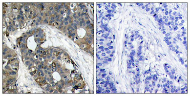• Immunohistochemical analysis of paraffin-embedded human breast carcinoma tissue using HSP27(Ab-82) Antibody(left) or the same antibody preincubated with blocking peptide(right).
