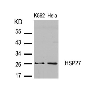 • Western blot analysis of extracts from K562 and Hela cells using HSP27(Ab-82) Antibody.