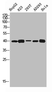 • Western blot analysis of HEPG2 823 293T AD293 HELA using SR-1D antibody. Antibody was diluted at 1:500. Secondary antibody was diluted at 1:20000