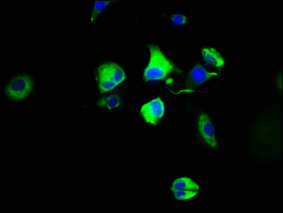 Immunofluorescence staining of MCF-7 cells with CSB-PA010895LA01HU at 1:100, counter-stained with DAPI. The cells were fixed in 4% formaldehyde, permeabilized using 0.2% Triton X-100 and blocked in 10% normal Goat Serum. The cells were then incubated with the antibody overnight at 4°C. The secondary antibody was Alexa Fluor 488-congugated AffiniPure Goat Anti-Rabbit IgG(H+L).