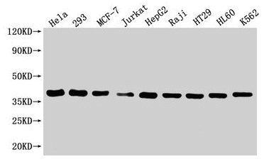Positive WB detected in: Hela whole cell lysate, HEK293 whole cell lysate, MCF-7 whole cell lysate, Jurkat whole cell lysate, HepG2 whole cell lysate, Raji whole cell lysate, HT29 whole cell lysate, HL60 whole cell lysate, K562 whole cell lysate