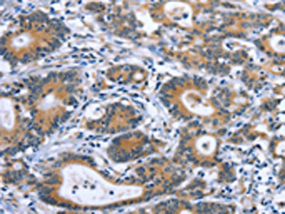 The image on the left is immunohistochemistry of paraffin-embedded Human colon cancer tissue using CSB-PA128816(IBSP Antibody) at dilution 1/30, on the right is treated with synthetic peptide. (Original magnification: ×200)