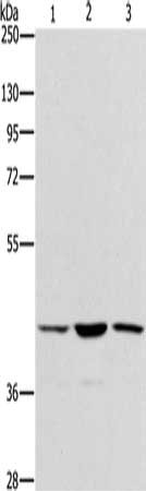 Gel: 8%SDS-PAGE, Lysate: 40 μg, Lane 1-3: Hela cells, K562 cells, hepG2 cells, Primary antibody: CSB-PA128816(IBSP Antibody) at dilution 1/350, Secondary antibody: Goat anti rabbit IgG at 1/8000 dilution, Exposure time: 10 seconds