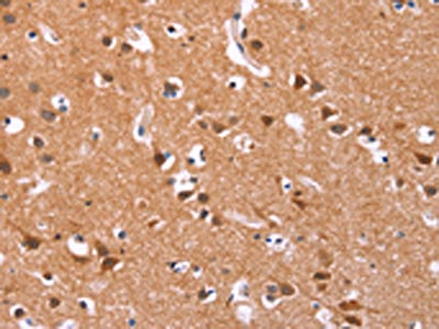 The image on the left is immunohistochemistry of paraffin-embedded Human brain tissue using CSB-PA084116(ICAM5 Antibody) at dilution 1/25, on the right is treated with synthetic peptide. (Original magnification: ×200)