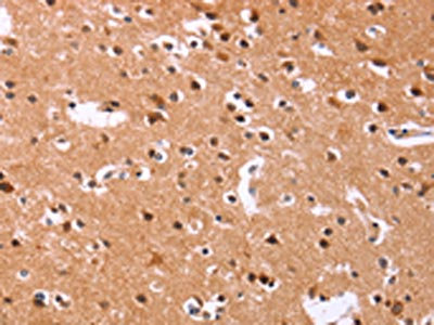 The image on the left is immunohistochemistry of paraffin-embedded Human brain tissue using CSB-PA468797(ICAM5 Antibody) at dilution 1/20, on the right is treated with synthetic peptide. (Original magnification: ×200)