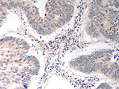 The image on the left is immunohistochemistry of paraffin-embedded Human colon cancer tissue using CSB-PA279895(ICOSLG Antibody) at dilution 1/30, on the right is treated with synthetic peptide. (Original magnification: ×200)