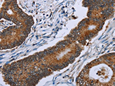The image on the left is immunohistochemistry of paraffin-embedded Human colon cancer tissue using CSB-PA586287(IDH2 Antibody) at dilution 1/60. (Original magnification: ×200)