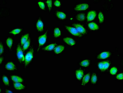 Immunofluorescent analysis of A549 cells using CSB-PA010991LA01HU at dilution of 1:100 and Alexa Fluor 488-congugated AffiniPure Goat Anti-Rabbit IgG(H+L)