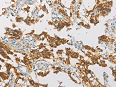 The image on the left is immunohistochemistry of paraffin-embedded Human thyroid cancer tissue using CSB-PA952993(IDH3G Antibody) at dilution 1/30, on the right is treated with fusion protein. (Original magnification: ×200)