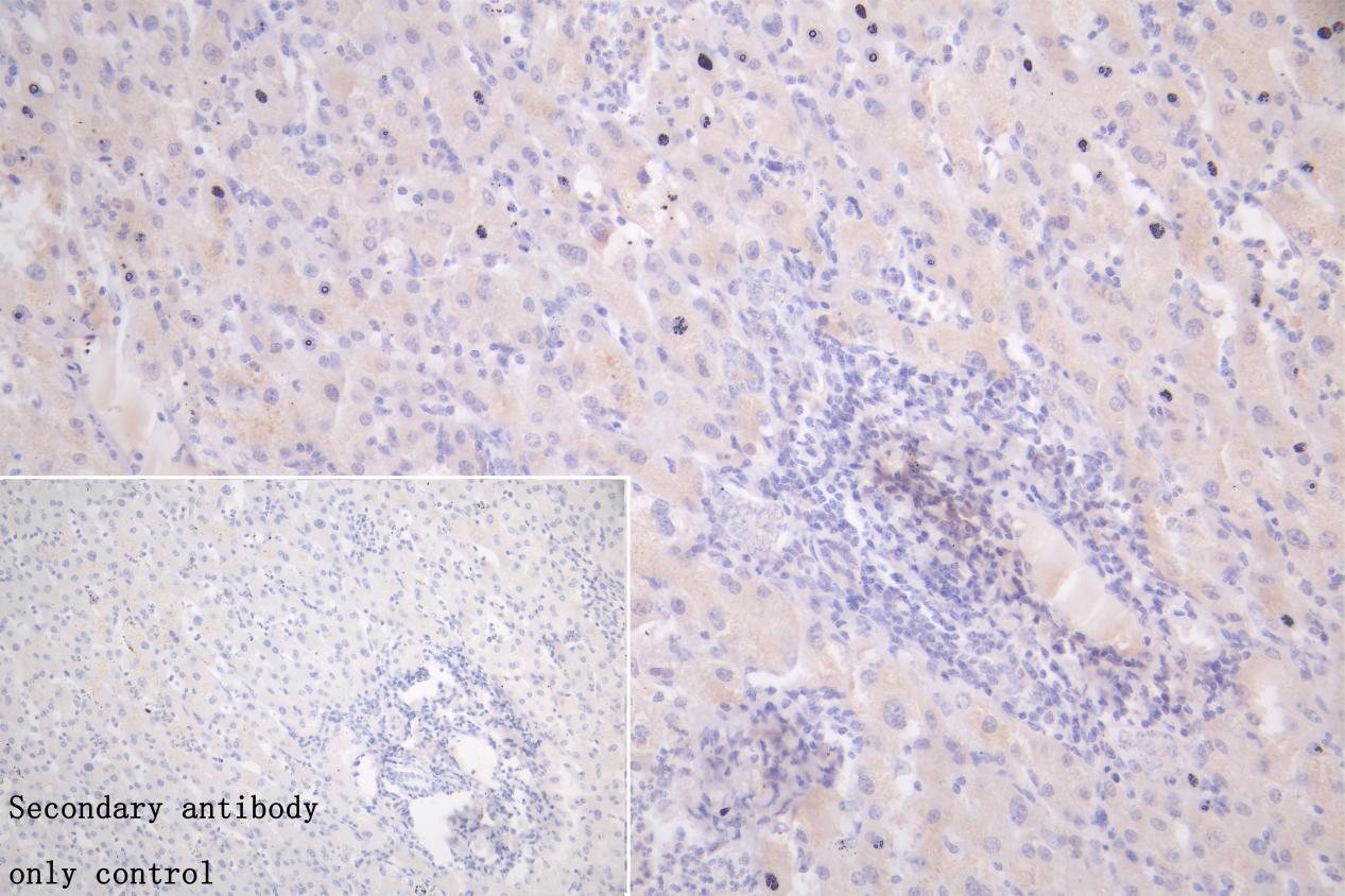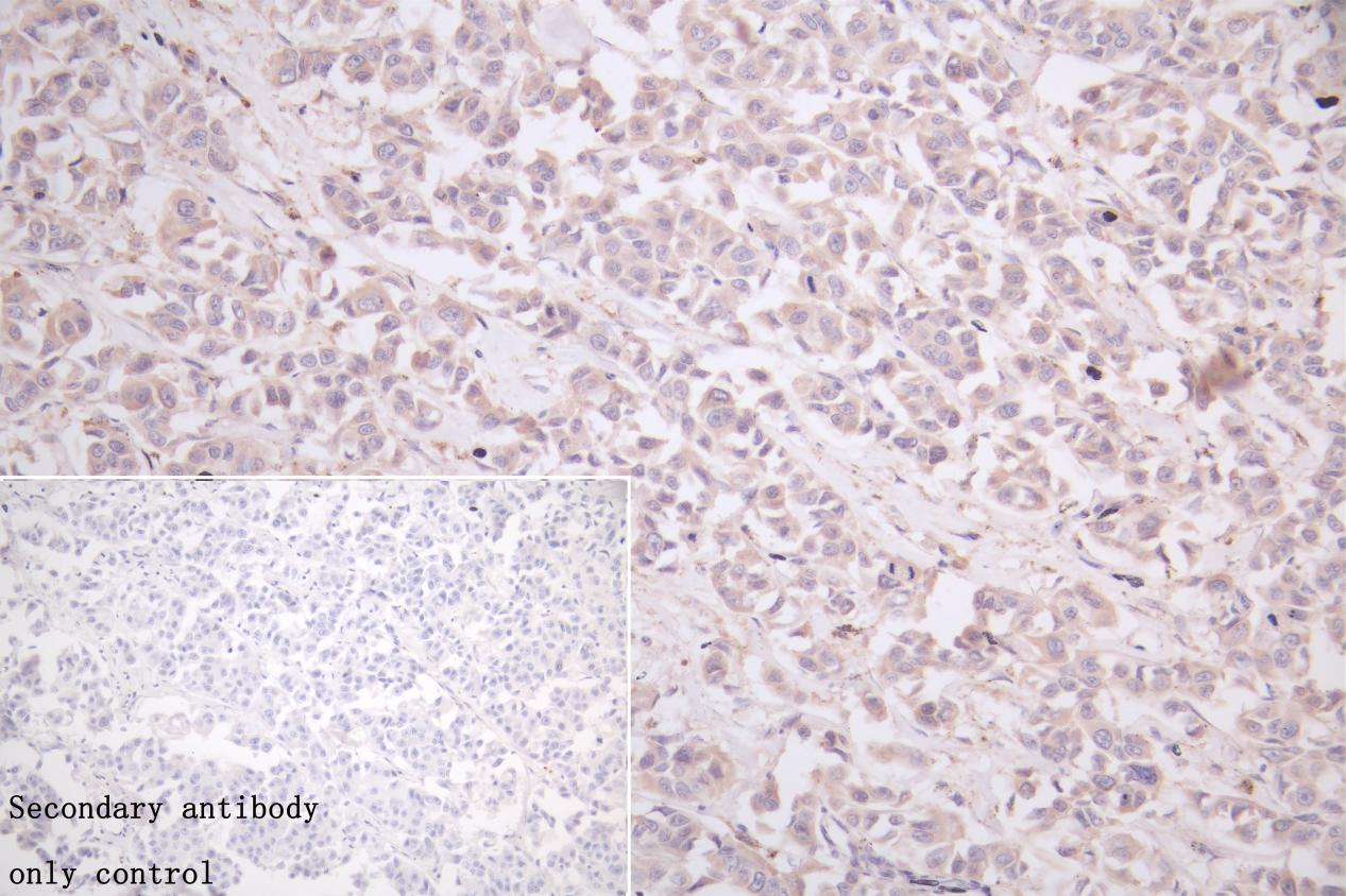 IHC image of CSB-PA011018LA01HU diluted at 1:50 and staining in paraffin-embedded human liver cancer performed on a Leica BondTM system. After dewaxing and hydration, antigen retrieval was mediated by high pressure in a citrate buffer (pH 6.0). Section was blocked with 10% normal goat serum 30min at RT. Then primary antibody (1% BSA) was incubated at 4°C overnight. The primary is detected by a Goat anti-rabbit polymer IgG labeled by HRP and visualized using 0.05% DAB. Secondary antibody only control: uses 1% BSA instead of primary antibody.