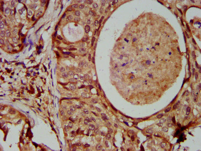 IHC image of CSB-PA011021LA01HU diluted at 1:600 and staining in paraffin-embedded human cervical cancer performed on a Leica BondTM system. After dewaxing and hydration, antigen retrieval was mediated by high pressure in a citrate buffer (pH 6.0). Section was blocked with 10% normal goat serum 30min at RT. Then primary antibody (1% BSA) was incubated at 4°C overnight. The primary is detected by a biotinylated secondary antibody and visualized using an HRP conjugated SP system.