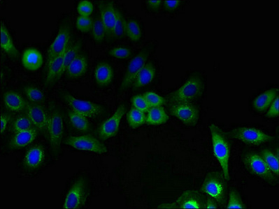• Immunofluorescent analysis of HepG2 cells using CSB-PA011025LA01HU at dilution of 1:100 and Alexa Fluor 488-congugated AffiniPure Goat Anti-Rabbit IgG(H+L)