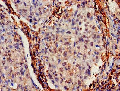 • IHC image of CSB-PA011025LA01HU diluted at 1:700 and staining in paraffin-embedded human lung cancer performed on a Leica BondTM system. After dewaxing and hydration, antigen retrieval was mediated by high pressure in a citrate buffer (pH 6.0). Section was blocked with 10% normal goat serum 30min at RT. Then primary antibody (1% BSA) was incubated at 4°C overnight. The primary is detected by a biotinylated secondary antibody and visualized using an HRP conjugated SP system.
