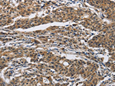 • The image on the left is immunohistochemistry of paraffin-embedded Human gastric cancer tissue using CSB-PA149561(IFNGR2 Antibody) at dilution 1/40, on the right is treated with synthetic peptide. (Original magnification: ×200)