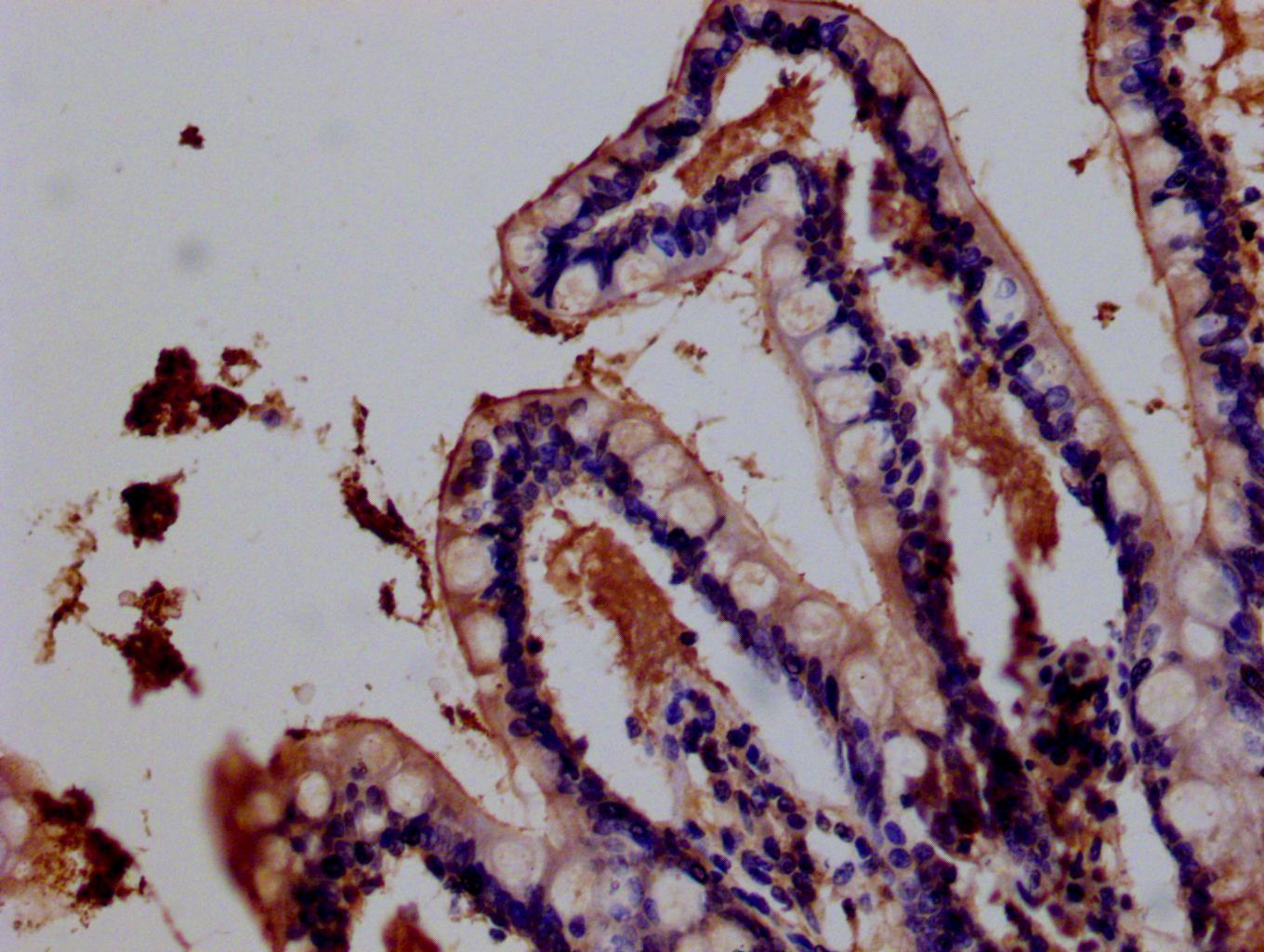• IHC image of CSB-PA816871ESR1HU diluted at 1:200 and staining in paraffin-embedded human small intestine tissue performed on a Leica BondTM system. After dewaxing and hydration, antigen retrieval was mediated by high pressure in a citrate buffer (pH 6.0). Section was blocked with 10% normal goat serum 30min at RT. Then primary antibody (1% BSA) was incubated at 4°C overnight. The primary is detected by a Goat anti-rabbit polymer IgG labeled by HRP and visualized using 0.05% DAB.