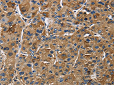 The image on the left is immunohistochemistry of paraffin-embedded Human liver cancer tissue using CSB-PA632749(IGF2R Antibody) at dilution 1/50, on the right is treated with synthetic peptide. (Original magnification: ×200)