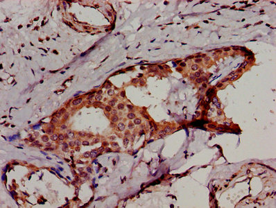 IHC image of CSB-PA16309A0Rb diluted at 1:500 and staining in paraffin-embedded human breast cancer performed on a Leica BondTM system. After dewaxing and hydration, antigen retrieval was mediated by high pressure in a citrate buffer (pH 6.0). Section was blocked with 10% normal goat serum 30min at RT. Then primary antibody (1% BSA) was incubated at 4°C overnight. The primary is detected by a biotinylated secondary antibody and visualized using an HRP conjugated SP system.