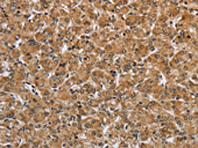 The image on the left is immunohistochemistry of paraffin-embedded Human liver cancer tissue using CSB-PA987228(IKBKE Antibody) at dilution 1/25, on the right is treated with fusion protein. (Original magnification: ×200)