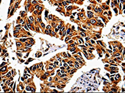 The image on the left is immunohistochemistry of paraffin-embedded Human lung cancer tissue using CSB-PA058807(IL13RA1 Antibody) at dilution 1/50, on the right is treated with fusion protein. (Original magnification: ×200)