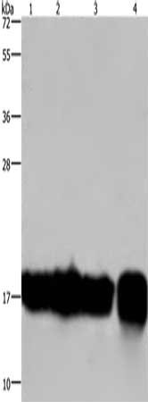 Gel: 10%SDS-PAGE, Lysate: 40 μg, Lane 1-4: A549 cells, K562 cells, Raji cells, human fetal intestine tissue, Primary antibody: CSB-PA959846(IL17C Antibody) at dilution 1/300, Secondary antibody: Goat anti rabbit IgG at 1/8000 dilution, Exposure time: 20 seconds