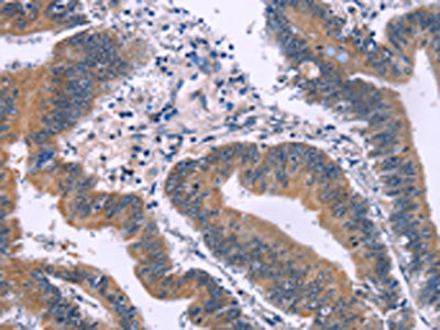 The image on the left is immunohistochemistry of paraffin-embedded Human colon cancer tissue using CSB-PA298832(IRAK1BP1 Antibody) at dilution 1/30, on the right is treated with fusion protein. (Original magnification: ×200)