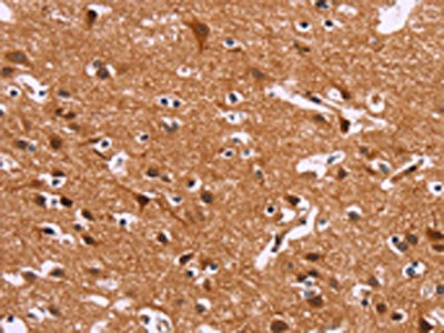 The image on the left is immunohistochemistry of paraffin-embedded Human brain tissue using CSB-PA298832(IRAK1BP1 Antibody) at dilution 1/30, on the right is treated with fusion protein. (Original magnification: ×200)