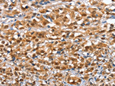 The image on the left is immunohistochemistry of paraffin-embedded Human esophagus cancer tissue using CSB-PA978564(IRAK3 Antibody) at dilution 1/50, on the right is treated with fusion protein. (Original magnification: ×200)