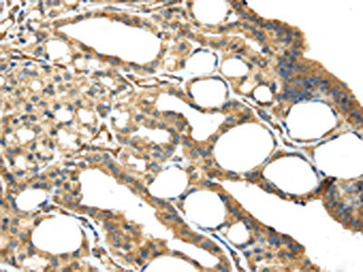 The image on the left is immunohistochemistry of paraffin-embedded Human thyroid cancer tissue using CSB-PA917179(ISM2 Antibody) at dilution 1/45, on the right is treated with synthetic peptide. (Original magnification: ×200)