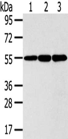 Gel: 8%SDS-PAGE,Lysate: 40 μg,Lane 1-3: 293T cells, LO2 cells, Lovo cells,Primary antibody: CSB-PA917179(ISM2 Antibody) at dilution 1/300 dilution,Secondary antibody: Goat anti rabbit IgG at 1/8000 dilution,Exposure time: 5 seconds