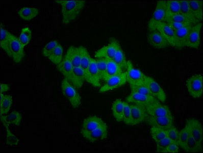 • Immunofluorescence staining of HepG2 cells with CSB-PA011866LA01HU at 1:133, counter-stained with DAPI. The cells were fixed in 4% formaldehyde, permeabilized using 0.2% Triton X-100 and blocked in 10% normal Goat Serum. The cells were then incubated with the antibody overnight at 4°C. The secondary antibody was Alexa Fluor 488-congugated AffiniPure Goat Anti-Rabbit IgG(H+L).