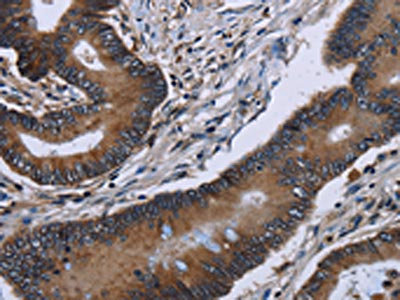• The image on the left is immunohistochemistry of paraffin-embedded Human colon cancer tissue using CSB-PA937919(ITGAE Antibody) at dilution 1/60, on the right is treated with fusion protein. (Original magnification: ×200)