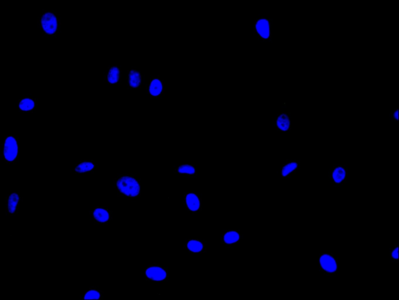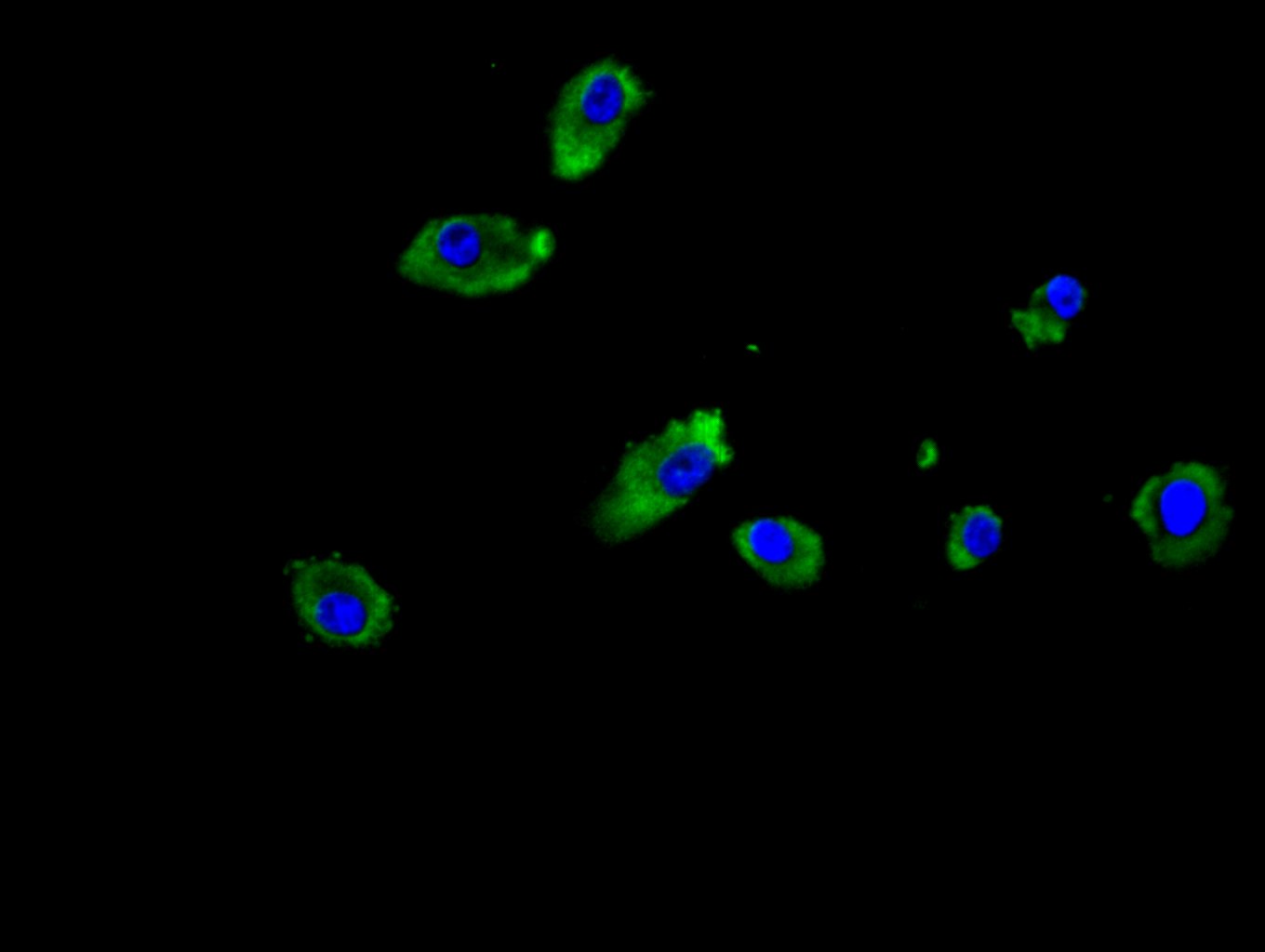 • Immunofluorescence staining of A549 cells with CSB-PA011890LA01HU at 1:30, counter-stained with DAPI. The cells were fixed in 4% formaldehyde and blocked in 10% normal Goat Serum. The cells were then incubated with the antibody overnight at 4°C. The secondary antibody was Alexa Fluor 488-congugated AffiniPure Goat Anti-Rabbit IgG(H+L).