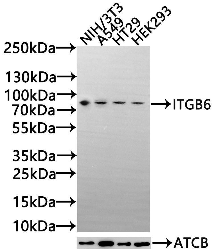 Positive WB detected in: NIH/3T3 whole cell lysate(30μg), A549 whole cell lysate(30μg), HT29 whole cell lysate(30μg),HEK293 whole cell lysate(30μg)