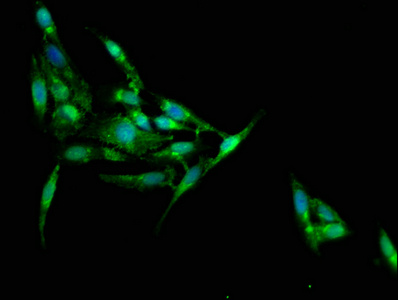 Immunofluorescence staining of Hela cells with CSB-PA872553LA01HU at 1:100, counter-stained with DAPI. The cells were fixed in 4% formaldehyde, permeabilized using 0.2% Triton X-100 and blocked in 10% normal Goat Serum. The cells were then incubated with the antibody overnight at 4°C. The secondary antibody was Alexa Fluor 488-congugated AffiniPure Goat Anti-Rabbit IgG(H+L).