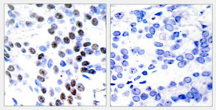 • Immunohistochemical analysis of paraffin-embedded human breast carcinoma tissue using c-Jun(Ab-93) Antibody(left) or the same antibody preincubated with blocking peptide(right).
