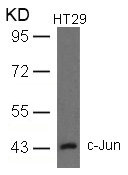• Western blot analysis of extracts from HT29 cells using c-Jun(Ab-93) Antibody.
