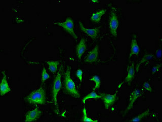 Immunofluorescent analysis of Hela cells using CSB-PA04689A0Rb at dilution of 1:100 and Alexa Fluor 488-congugated AffiniPure Goat Anti-Rabbit IgG(H+L)