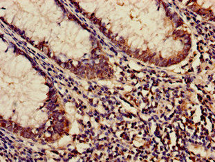 Immunohistochemistry of paraffin-embedded human colon cancer using CSB-PA04689A0Rb at dilution of 1:100