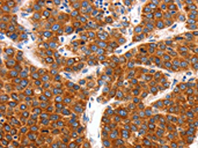 • The image on the left is immunohistochemistry of paraffin-embedded Human liver cancer tissue using CSB-PA945687(KCNC2 Antibody) at dilution 1/100, on the right is treated with synthetic peptide. (Original magnification: ×200)