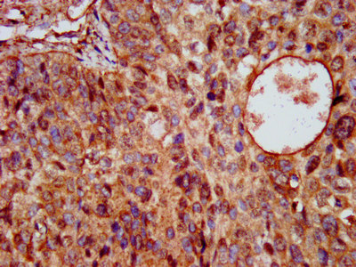 IHC image of CSB-PA22569A0Rb diluted at 1:200 and staining in paraffin-embedded human cervical cancer performed on a Leica BondTM system. After dewaxing and hydration, antigen retrieval was mediated by high pressure in a citrate buffer (pH 6.0). Section was blocked with 10% normal goat serum 30min at RT. Then primary antibody (1% BSA) was incubated at 4°C overnight. The primary is detected by a biotinylated secondary antibody and visualized using an HRP conjugated SP system.
