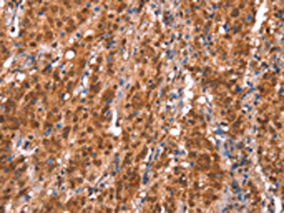 The image on the left is immunohistochemistry of paraffin-embedded Human gastic cancer tissue using CSB-PA092041(KCNJ6 Antibody) at dilution 1/20, on the right is treated with synthetic peptide. (Original magnification: ×200)