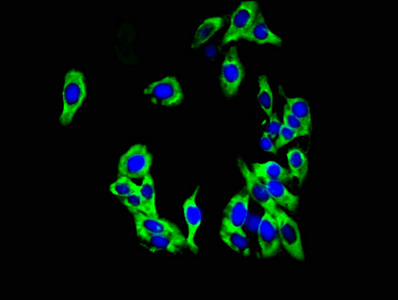 Immunofluorescent analysis of HepG2 cells using CSB-PA012062LA01HU at dilution of 1:100 and Alexa Fluor 488-congugated AffiniPure Goat Anti-Rabbit IgG(H+L)