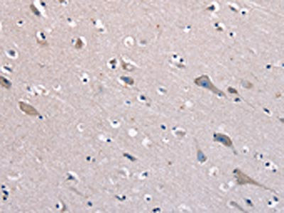 The image on the left is immunohistochemistry of paraffin-embedded Human brain tissue using CSB-PA083173(KCNQ5 Antibody) at dilution 1/60, on the right is treated with fusion protein. (Original magnification: ×200)