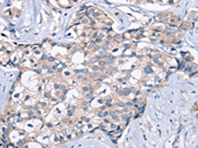 The image on the left is immunohistochemistry of paraffin-embedded Human breast cancer tissue using CSB-PA083173(KCNQ5 Antibody) at dilution 1/60, on the right is treated with fusion protein. (Original magnification: ×200)
