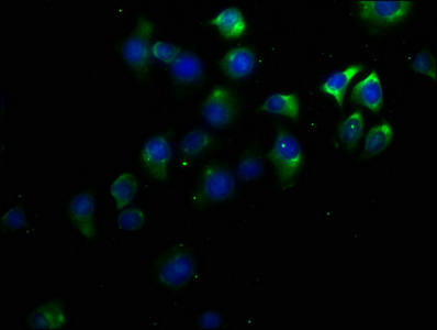 Immunofluorescence staining of A549 cells with CSB-PA747493LA01HU at 1:50, counter-stained with DAPI. The cells were fixed in 4% formaldehyde, permeabilized using 0.2% Triton X-100 and blocked in 10% normal Goat Serum. The cells were then incubated with the antibody overnight at 4°C. The secondary antibody was Alexa Fluor 488-congugated AffiniPure Goat Anti-Rabbit IgG(H+L).