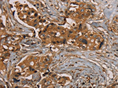 The image on the left is immunohistochemistry of paraffin-embedded Human breast cancer tissue using CSB-PA099632(KIF20A Antibody) at dilution 1/25, on the right is treated with fusion protein. (Original magnification: ×200)
