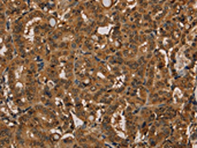 The image on the left is immunohistochemistry of paraffin-embedded Human thyroid cancer tissue using CSB-PA966542(KIF20A Antibody) at dilution 1/20, on the right is treated with fusion protein. (Original magnification: ×200)