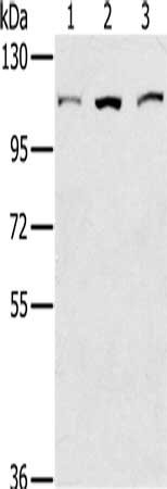 Gel: 6%SDS-PAGE, Lysate: 40 μg, Lane 1-3: K562 cells, 293T cells, hela cells, Primary antibody: CSB-PA966542(KIF20A Antibody) at dilution 1/400, Secondary antibody: Goat anti rabbit IgG at 1/8000 dilution, Exposure time: 10 seconds