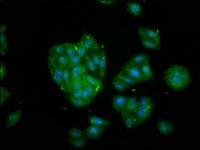 Immunofluorescence staining of HepG2 cells with CSB-PA839399LA01HU at 1:133, counter-stained with DAPI. The cells were fixed in 4% formaldehyde, permeabilized using 0.2% Triton X-100 and blocked in 10% normal Goat Serum. The cells were then incubated with the antibody overnight at 4°C. The secondary antibody was Alexa Fluor 488-congugated AffiniPure Goat Anti-Rabbit IgG(H+L).