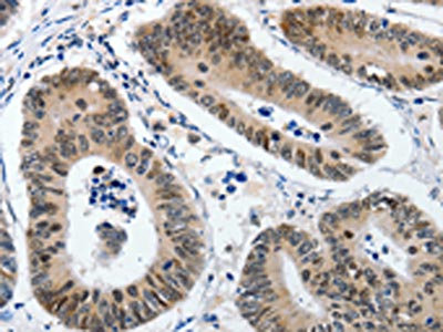 • The image on the left is immunohistochemistry of paraffin-embedded Human colon cancer tissue using CSB-PA234904(KLF5 Antibody) at dilution 1/120, on the right is treated with synthetic peptide. (Original magnification: ×200)